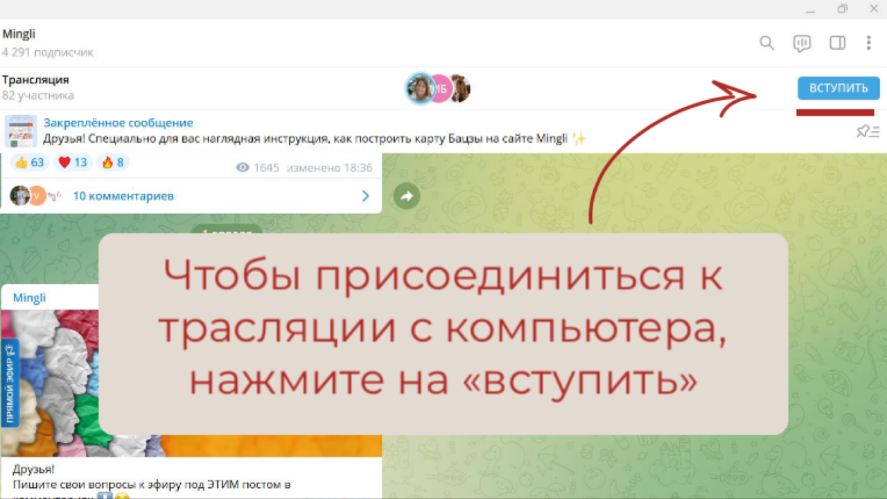 Ниже вы видите инструкцию по подключению к трансляции через WEB-версию Telegram.