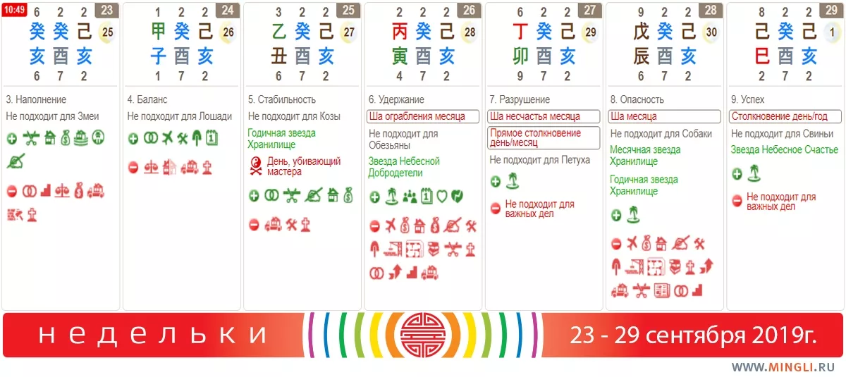 25 сентября, среда. Прекрасный день, способствующий процветанию, можно делать практически любые позитивные дела. Только фэншуисты отдыхают, так как Лопань сегодня использовать нельзя. Этот день также не подходит рожденным в год Козы.