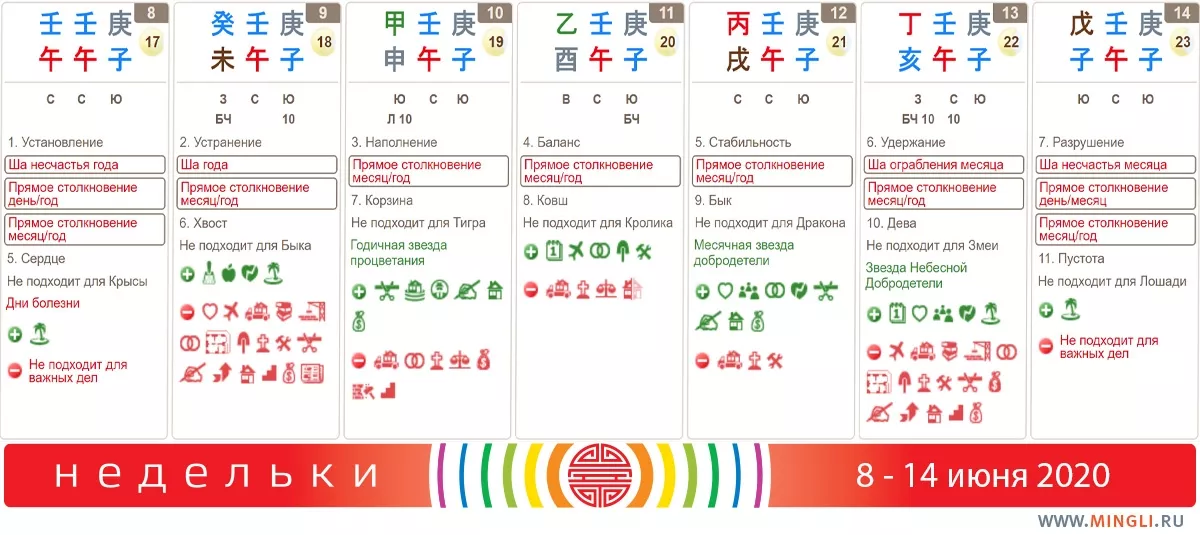 13 июня, суббота. Не подходит для начала поездки, решения финансовых вопросов и подписания контрактов, но в целом день неплохой. Используйте его для переговоров, достижения договоренностей (лучше о дружбе и любви, а не о деньгах), особенно, если вам полезен огонь. Лучше выбирать час Дракона или добавить оттенки зеленого в вашу одежду. В час Петуха можно прогуляться на юго-запад, чтобы улучшить свою удачу (не подходит рожденным в день или год Змеи); можно встретить человека в желтой рубашке или услышать пение стаи птиц.