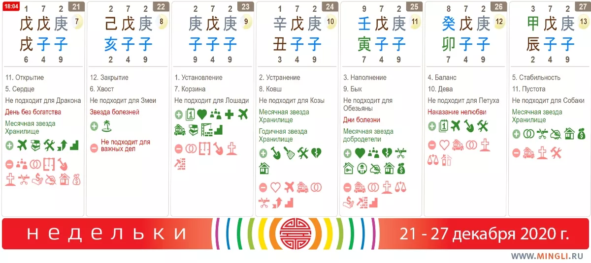 25 декабря, пятница. Отлично подойдет для переезда в новый дом, строительства, путешествий, сбора долгов, начинания бизнеса и проектов и многих других дел. Переговоры (если нет персональных противопоказаний) должны пройти гладко; можно постараться договориться, особенно, если вашей карте бацзы полезна Вода. Не навещайте заболевших друзей, медцентры; также день не подойдет для начала земляных работ.