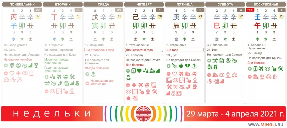 3 апреля, суббота. Хороший день для путешествий, начала бизнеса и проектов, свадьбы, переезда в новый дом. Приведет к рождению сына, хорошему урожаю и удаче в семье. Сегодня стоит поберечь здоровье тем, кто родился в день иньского Металла: не рискуйте понапрасну.