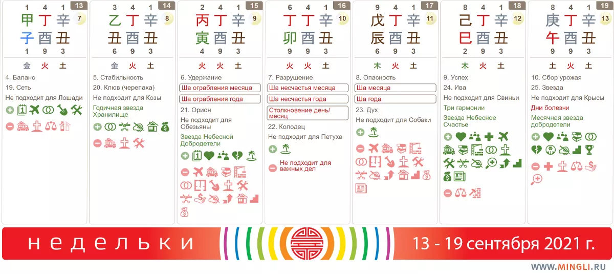 18 сентября, суббота. Отличный день! Очень благоприятен для свадьбы, переезда в новый дом, начала строительства, земляных работ, открытия бизнеса, запуска проектов, путешествий. Так что не упустите возможности, особенно, если вам благоприятна Земля! Энергии дня сглаживают течение большинства мероприятий; вам в помощь часы Лошади и Обезьяны. Свиньям день подходит меньше остальных.
