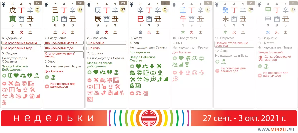 27 сентября, понедельник. День хорош для переговоров, примирения, свиданий, мягкого разрыва отношений. Но совершенно не годится для подписания финансовых документов и начала поездки. Особенно если ваша карта - слабого Дерева.