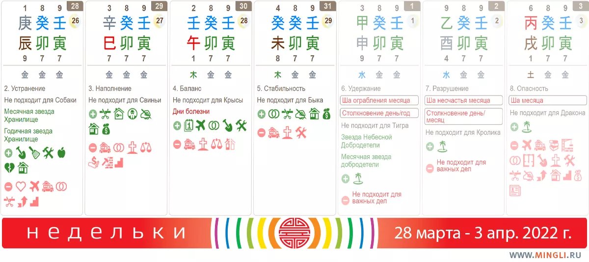 29 марта, вторник. Благоприятно заниматься ремонтом, особенно на юго-востоке. Хороший день для путешествий, начала бизнеса и проектов, свадьбы, переезда в новый дом и других позитивных дел. Все начатое в этот день множится. Действия, предпринятые в такой день, приведут к рождению долгожданного сына и удаче в семье. Если вы иньский Металл – следите за здоровьем. В час Кролика (да, довольно рано), стоит прогуляться на запад, чтобы найти помощь и справедливость. Направление подойдет и тем, кто хочет продать недвижимость. Встретить можно человека, несущего книги, охотника, человека с животным. Не подходит Свиньям по дню или году рождения.