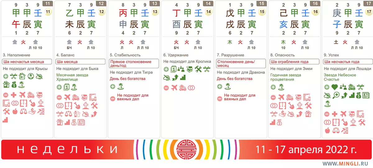 17 апреля, воскресенье. Отличный день, хотя ци его не очень сильная. Также пара нюансов: не стоит начинать лечение или назначать свидание с незнакомцами или в злачных местах. Лучше подумайте о работе, попробуйте найти решения для текущих задач. Янскому Металлу, янской и иньской Воде лучше всего поддержать свое здоровье.