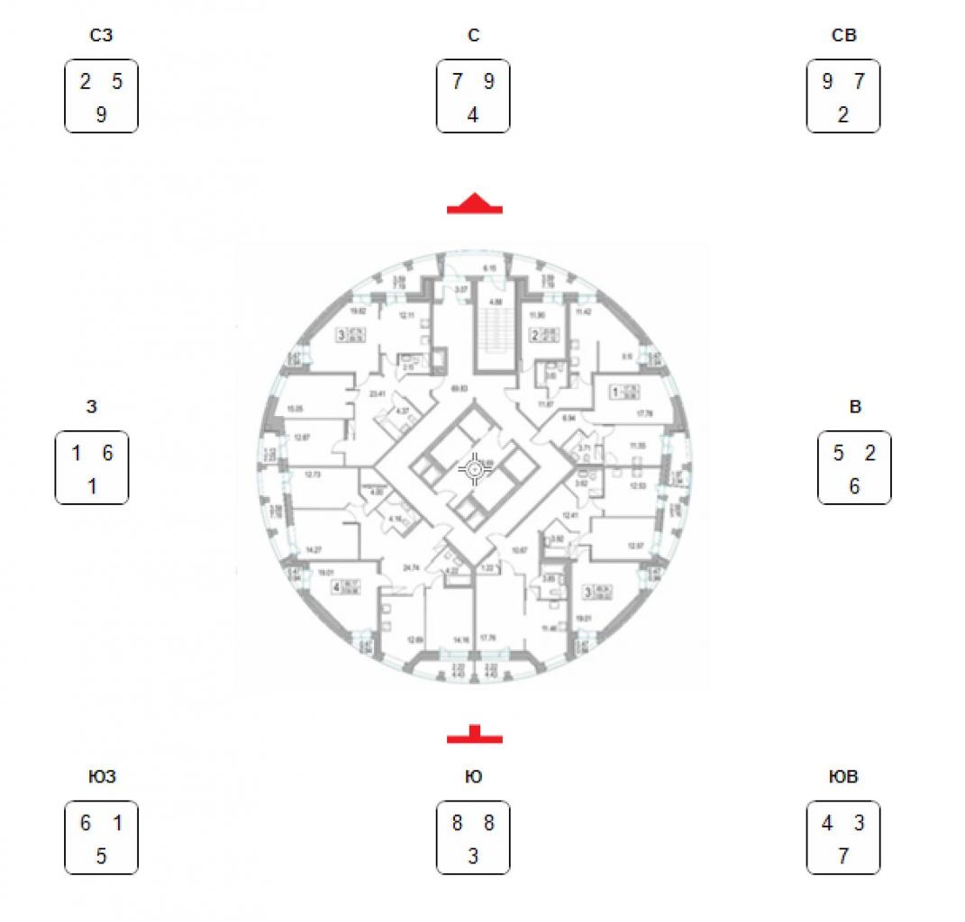 И есть еще один минус, на этот раз уже с точки зрения потенциала жилья: основной уклон местности идет к юго-западу, а лифт и лестница расположены на северо-западе относительно «синей» квартиры. Это означает, что потенциал возможностей у нее не максимальный.