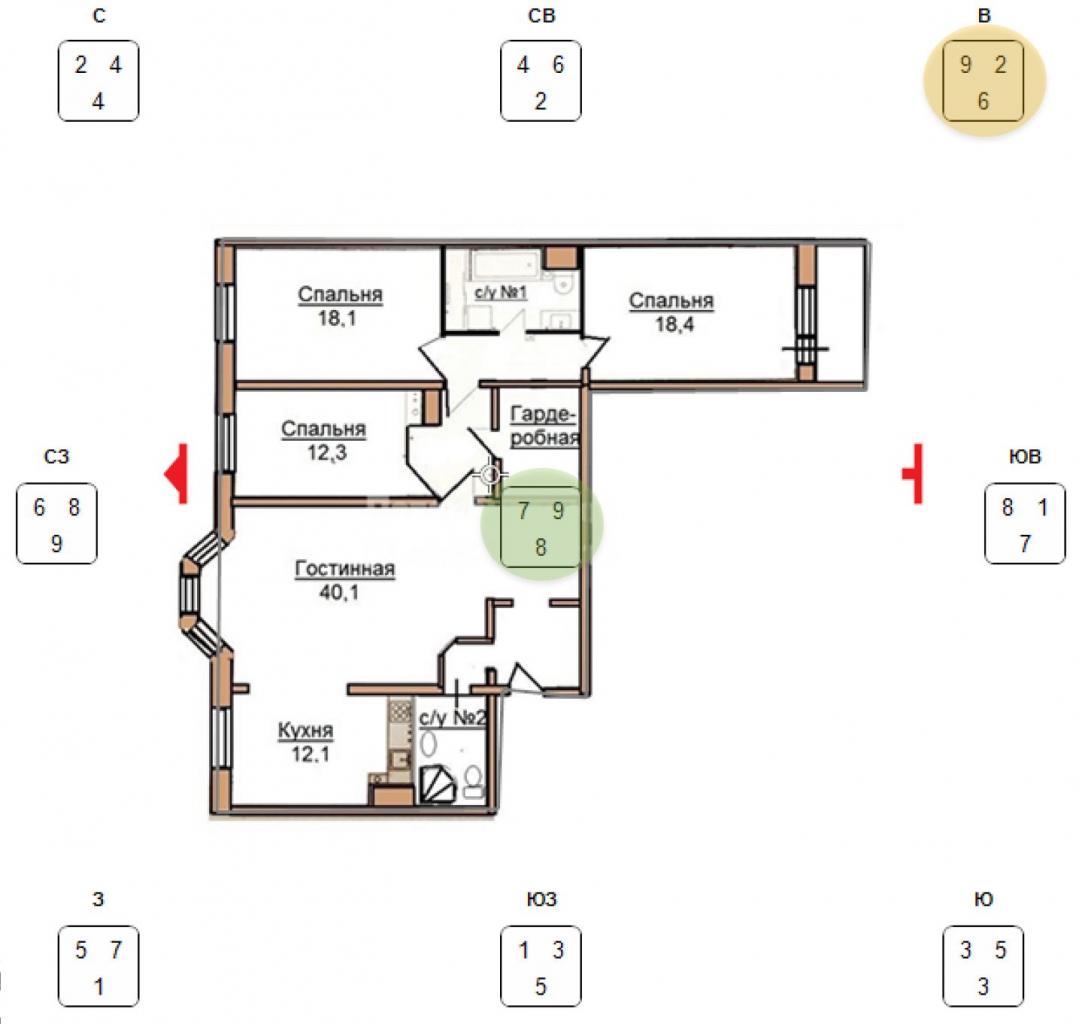 В этой квартире водная 9 попала в центр, и внешняя активность ей не поможет. А это значит, что потенциал финансового процветания такой квартиры в 9 периоде падает. В первом периоде он снизится еще больше.