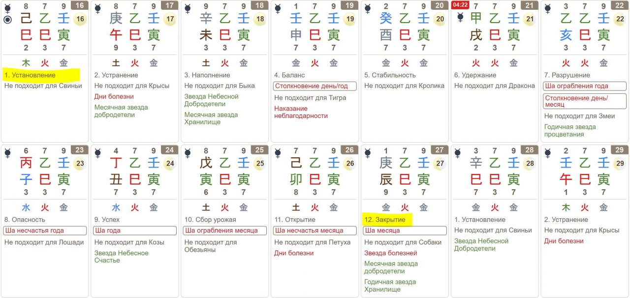 В календаре вы можете увидеть 12 повторяющихся Управителей Дня (Цзянь Чу), начиная с Установления и заканчивая Завершением. Вы можете почитать описания этих Управителей и увидите, что они отлично подходят для планирования процессов небольшой длительности: с началом, парой пиков активности, паузой в середине и завершением.