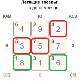 Юго-восток. Комбинация звезд способствует новым творческим идеям, продвижению на работе, привлекательности. Работа больше на репутацию, нежели на повышение дохода. Но в отношениях могут быть сложности, они не стабильны. У женщин, которые здесь будут долго находиться, возможны обострения хронических заболеваний, депрессивные мысли. Больше всего влияние могут почувствовать люди с гуа 4. Особенно если во внешнем окружении в этом секторе проходит оживленная дорога или рядом есть опоры ЛЭП. Для баланса стихий поставьте здесь сосуд с водой, или 3-4 веточки бамбука в воде.