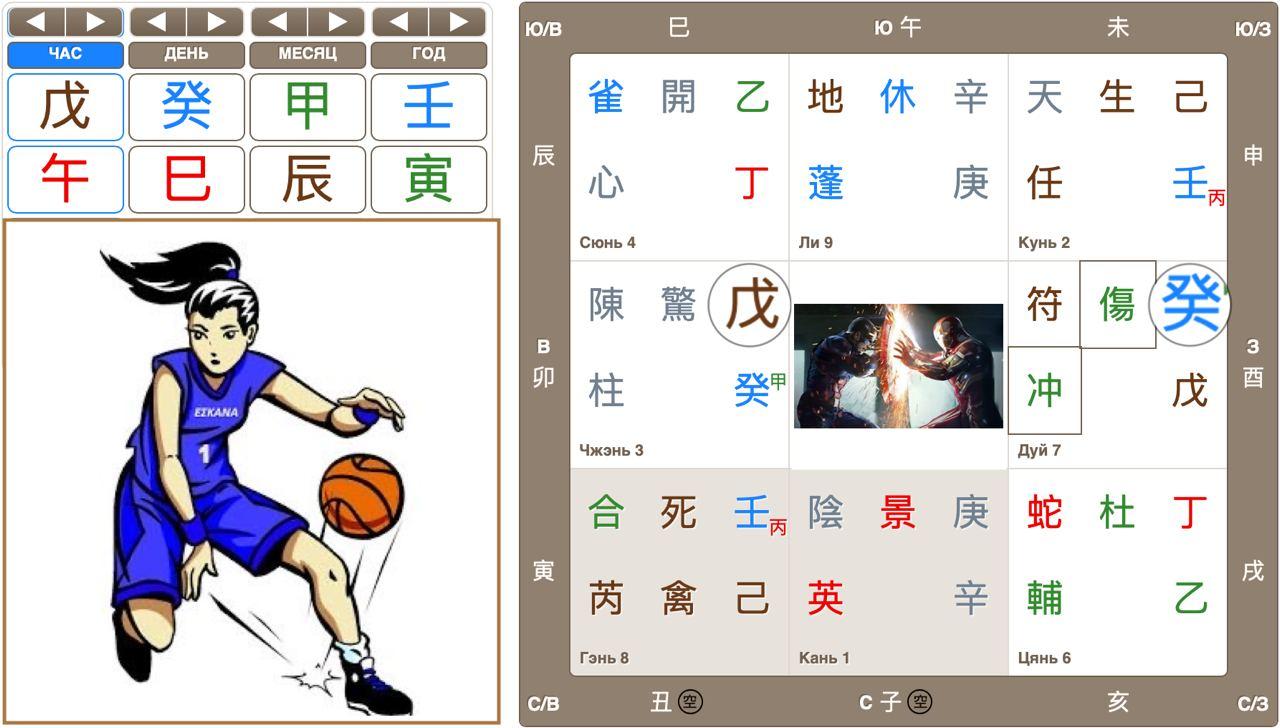 Напомню, что в этом раскладе уже другой час, поэтому команду дочери смотрели как Небесный Ствол текущего дня 癸 в доме Гэнь, а команду-соперника Небесный Ствол часа 己 в доме Кань. В этой таблице Ци Мэнь прорисовывается уже менее напряженная игра, но тоже с изюминкой: обе команды 癸 и 己 «опускаются» в пустоту (серый цвет в таблице Ци Мэнь). При этом команда 癸 сохраняет свой боевой напор 冲 и мощные атаки 傷. Команда 己 предпочитает высокие 天 , точные 生 броски, но может ошибаться 辛.