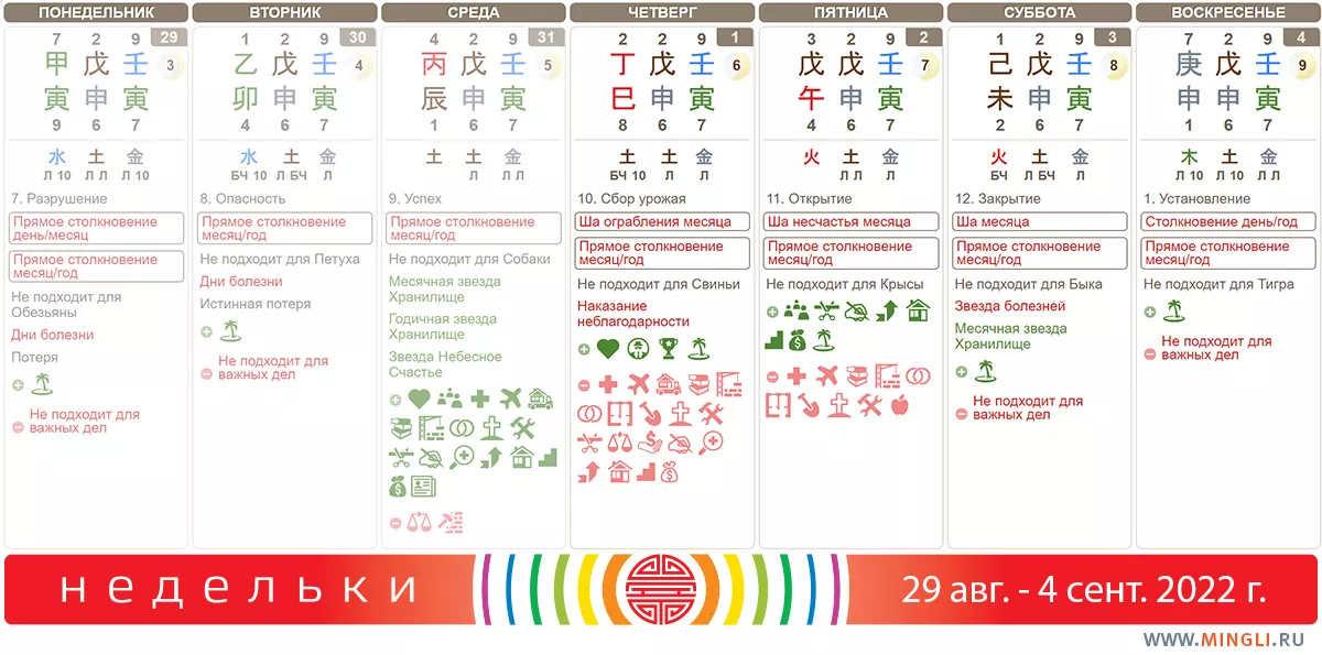1 сентября, четверг. Так уж получилось, что на День Знаний выпало не очень хорошее сочетание земных ветвей. Напомните школьникам о правилах безопасности, да и вообще, лучше после линейки и первых уроков им возвратиться домой: день довольно конфликтный. Этим советом не стоит пренебрегать, если у ребенка в карте бацзы есть огненное наказание: Тигр, Обезьяна и Змея. Взрослым сегодня не стоит подписывать важные документы, решать финансовые вопросы и отправляться в путешествия.