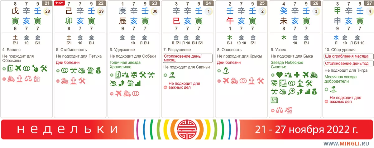 22 ноября, вторник. Отличный день. Подходит для земляных работ, строительства, свадьбы, переезда в новый дом, путешествий, начинания бизнеса и проектов, если только вы не Петух. А вот заболевших друзей сегодня лучше не навещать, да и с медициной не сталкиваться.