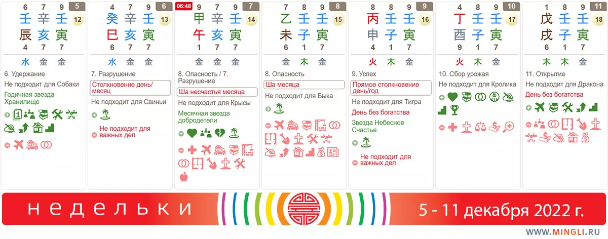 5 декабря, понедельник. Хороший день, подходит для большинства средних по важности дел, особенно, для приобретения ценных вещей, переговоров, начала учебы или ремонта. Если Вода вам благоприятно – еще лучше! Если на этой неделе вы хотите сделать что-то важное, лучше использовать понедельник, потому что следующий симпатичный день только в субботу.
