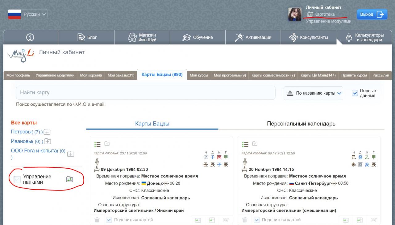 Теперь карты Бацзы и Ци Мэнь, которые у вас сохранены, можно рассортировать по папкам. Например, по семьям или по компаниям, чтобы было проще искать. Дополнили информацию в карточке и адаптировали картотеку под мобильные устройства. Теперь карту можно редактировать прямо в картотеке.