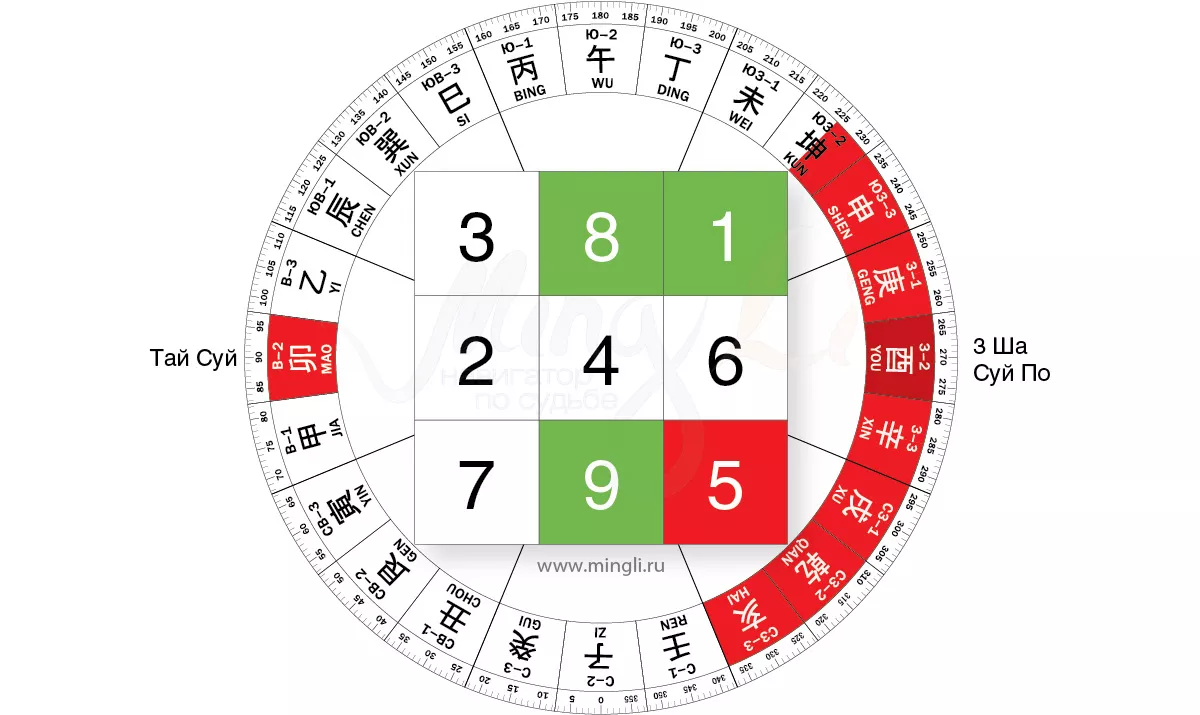 Обратите внимание, что двойку усиливают и внешние факторы – ша, уродливые структуры, вода и всяческая активность с восточной стороны жилища. А в этом году еще и Тай Суй находится на востоке, поэтому направление очень активно!