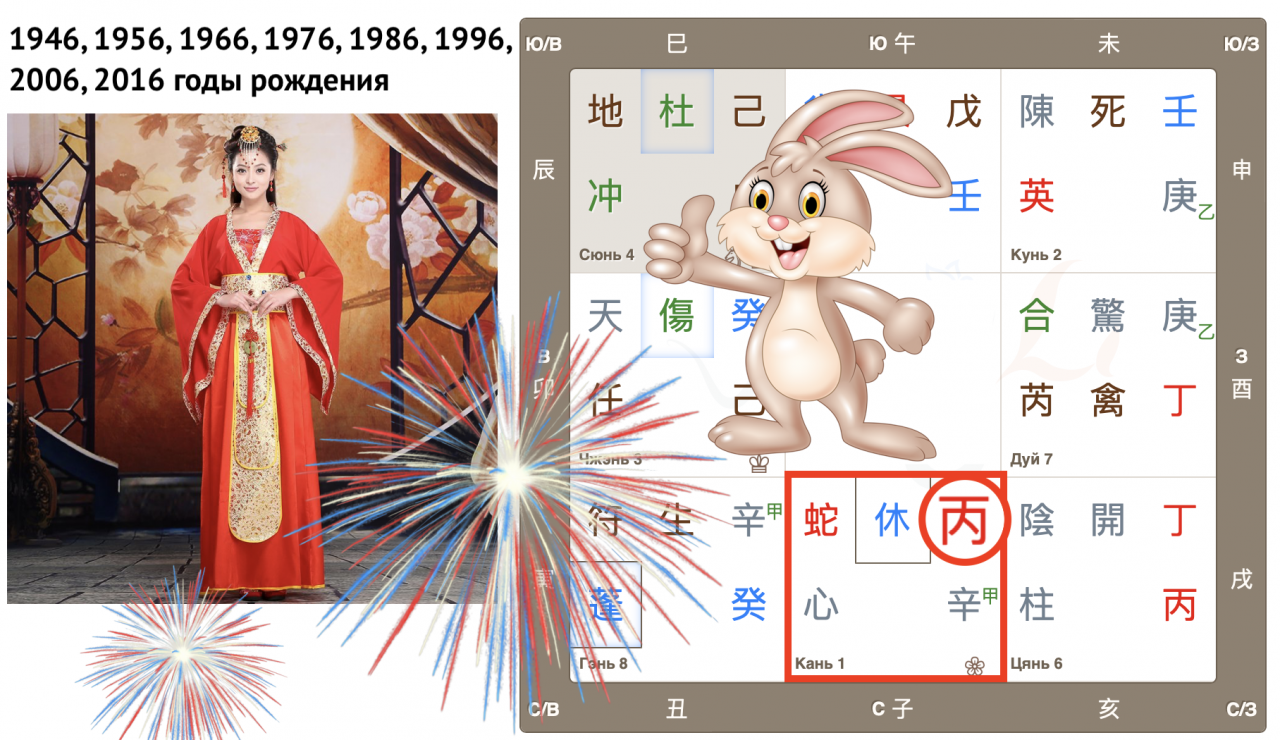 Как видим, Небесный ствол года 癸 Гуй (иньская вода) опустился в дом Чжэнь с Земной ветвью 卯 Мао (Кролик). Вот так сюрприз! Ствол и ветвь приходящего года в одном дворце, так случается далеко не всегда. Можем предположить, что влияние энергий года четко выражено, удвоено.