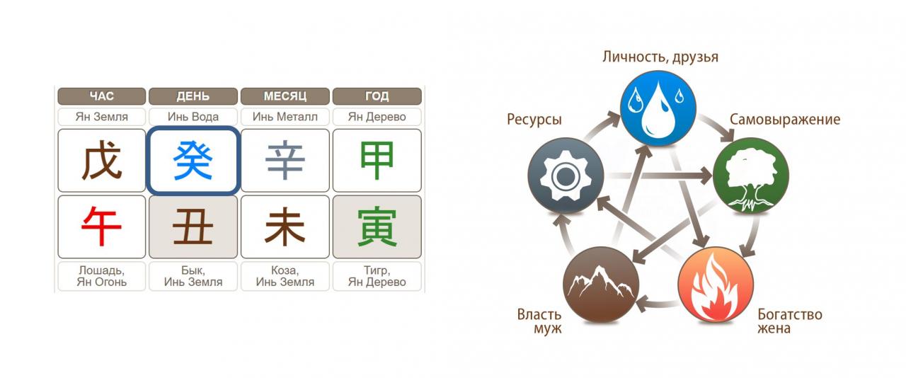 Верхний иероглиф второго слева столбца – это Господин дня, он же Столп дня или Дневная доминанта. В данном случае это иньская Вода. Нижний ряд иероглифов – земные ветви, они названы именами животных. Все названия можно прочитать. Под Господином Дня расположена земная ветвь дня рождения, а в крайнем справа столбце – земная ветвь года рождения.