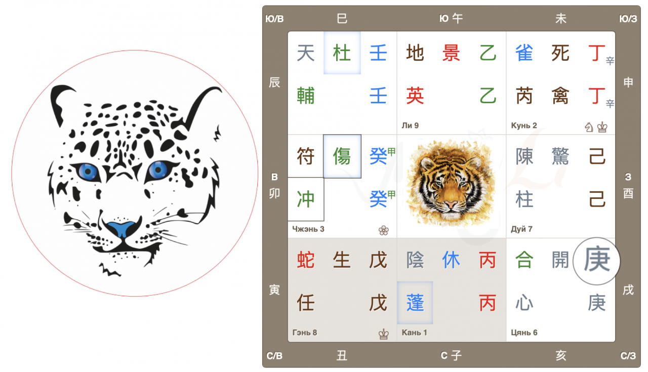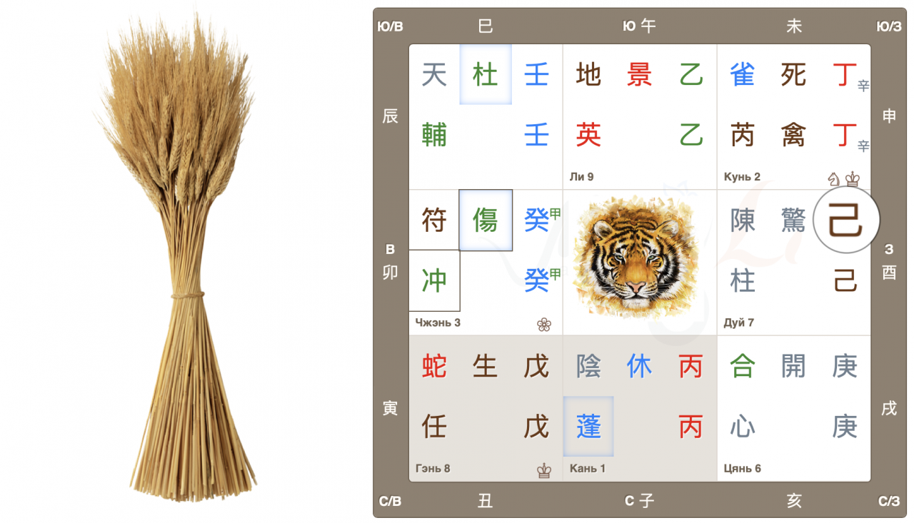 Во дворце Чжэнь собрались 3 важных знака: Главный дух 符 Джи Фу, Главные врата 傷 Ранение и, Небесный ствол года 癸, Тай Суй. Высока вероятность принятия судьбоносных решений, в том числе во властных структурах.