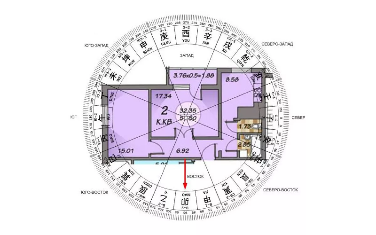 Красная стрелка показывает, где на шаблоне можно увидеть направление стороны света – 45 градусов востока разделено на 3 «горы» по 15 градусов: восток-1, восток-2, восток-3. Все три горы относятся к востоку или триграмме Чжэнь, если вас интересует триграмма багуа.
