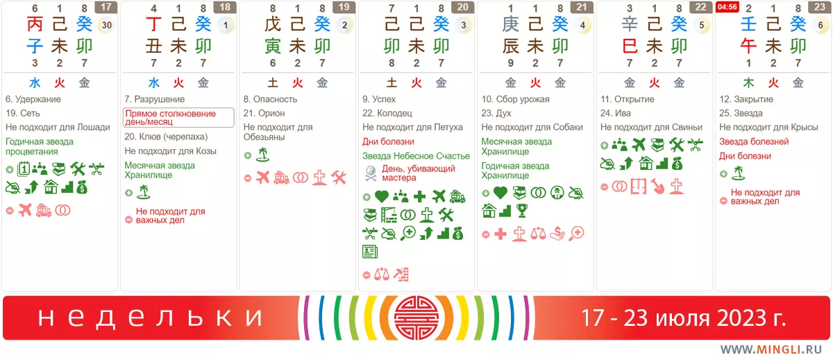 17 июля, понедельник. Отличный день! Хорош для строительства, земляных работ, переезда в новый дом, перемещения, начала бизнеса или проектов, путешествий. Те, кто знает систему На Инь, понимает, что сегодня можно выбрать очень неплохой час для важного дела, чтобы получить поток благоприятной ци. Сегодня также можно планировать, начинать учиться, да и вообще, хороши любые действия, ведущие к вашей мечте о финансовом процветании!