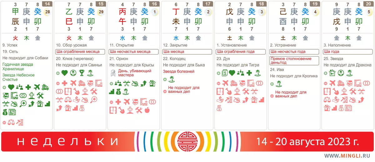 16 августа, среда. Сам день вполне хороший, но с нюансами – не стоит начинать лечение и лучше повременить с экстремальными видами спорта. Кроме того, Фэн Шуй, а точнее, измерениями сегодня заниматься нельзя. А так – широкий спектр всевозможных начинаний доступен для желающих: начало новых проектов или бизнеса, переезды, путешествия, переговоры и подписания контрактов. Использование этого дня правильно принесет хорошую удачу и богатство, благородных помощников, собственность, здоровье семье в течение 60-120 дней. В первую очередь, рекомендуем его тем, кому полезен Огонь. Крысам по году среда не подходит.