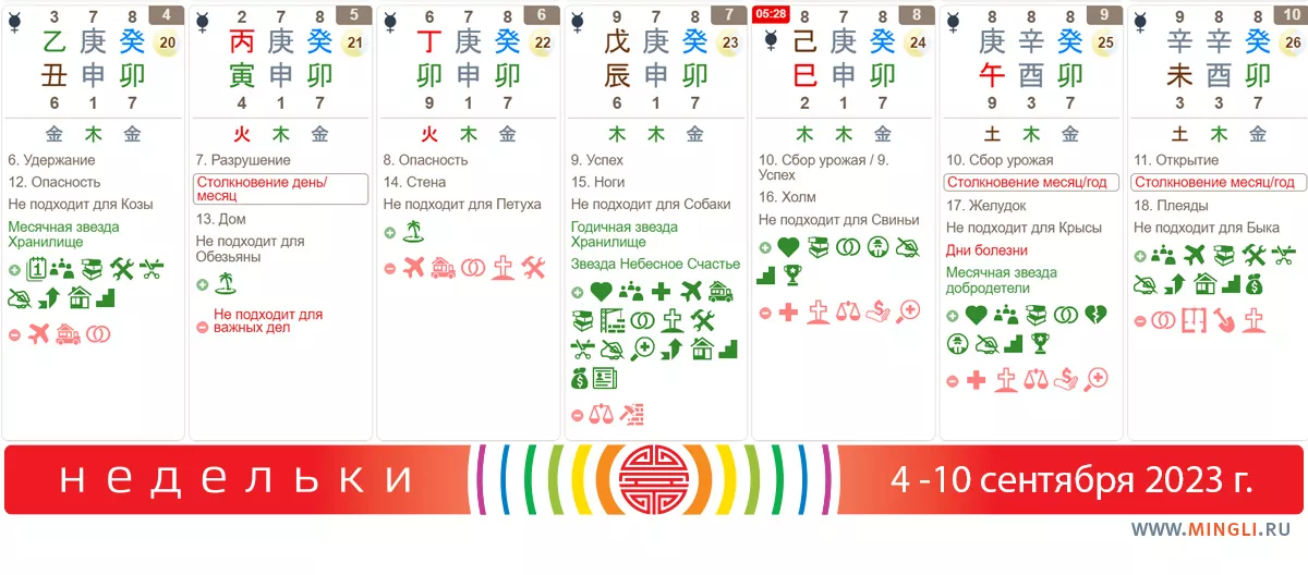 6 сентября, среда. В этом дне присутствуют хорошие благородные звезды. Он благоприятен для начала бизнеса и проектов, путешествий, переезда в новый дом, перехода на новую должность (с поправкой на наш любимый попятный Меркурий). Дела, сделанные в этот день, приносят процветание семье, рождение прекрасного сына, неожиданное богатство, роскошную жизнь. И да, в нашем календаре он отмечен как день для отдыха, так как его ци, увы, не сильна.