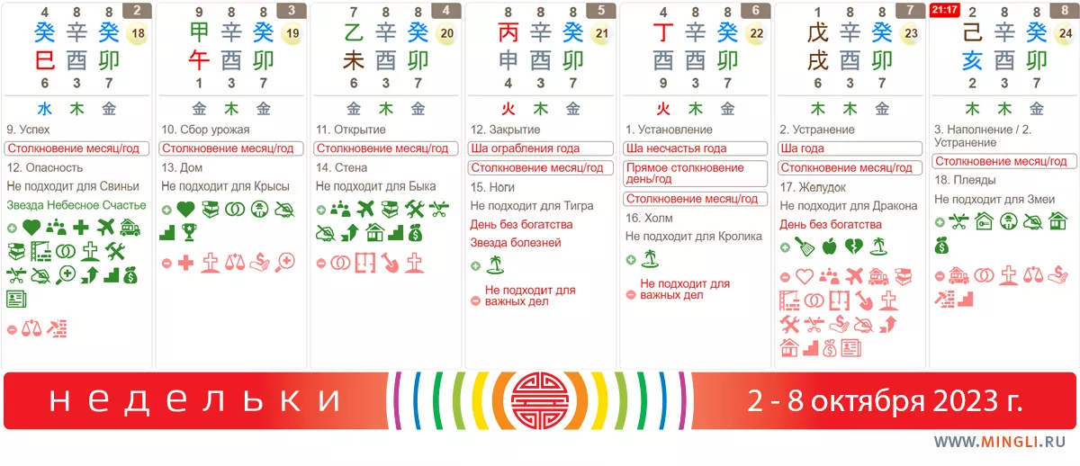 2 октября, понедельник. Первая половина недели дает нам шансы, конечно, учитывая общую ситуацию в месяце. На сегодня можно запланировать почти любое из позитивных дел, если 1). Вода вам полезна 2). вы не Свинья по году 3). у вас в карте Бацзы нет столкновения Кролик-Петух. А вот в суд подавать не стоит.