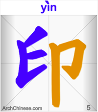 Гораздо более информативным для нас здесь является второй знак – 印 yìn. Его поле значений связано с понятиями «печать», «штамп», «официальная бумага», а также «административная власть» и «важный/чиновничий пост». Даже одно из выражений, в китайском языке означающее уход с официальной должности, буквально переводится как «отказаться от печати». Иероглиф представляет собой пиктограмму и также состоит из двух частей: 爪 zhuǎ, «коготь» или «лапа», и卩jié – «верительная бирка», «печать». Таким образом, исходя из этимологии иероглифа, он буквально означает «надавливать/нажимать рукой на печать», то есть, делать оттиск.