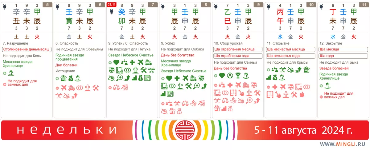 5 августа, понедельник. Начинаем недельку с осторожностью: Столкновение привносит конфликтности и приводит к ошибочным решениям и действиям. Поэтому лучше заниматься второстепенными и обыденными делами, а вот проводить важные встречи или начинать новое не стоит! Тем, у кого в анамнезе (в карте Бацзы) есть Быки и Козы, особенно металлические – стоит обратить внимание на этот день: не выяснять отношения, не терять бдительность за рулем и во время любых травмоопасных занятий. Час Козы лучше провести максимально спокойно (смотрите время в вашем городе, а не 13-15 часов).