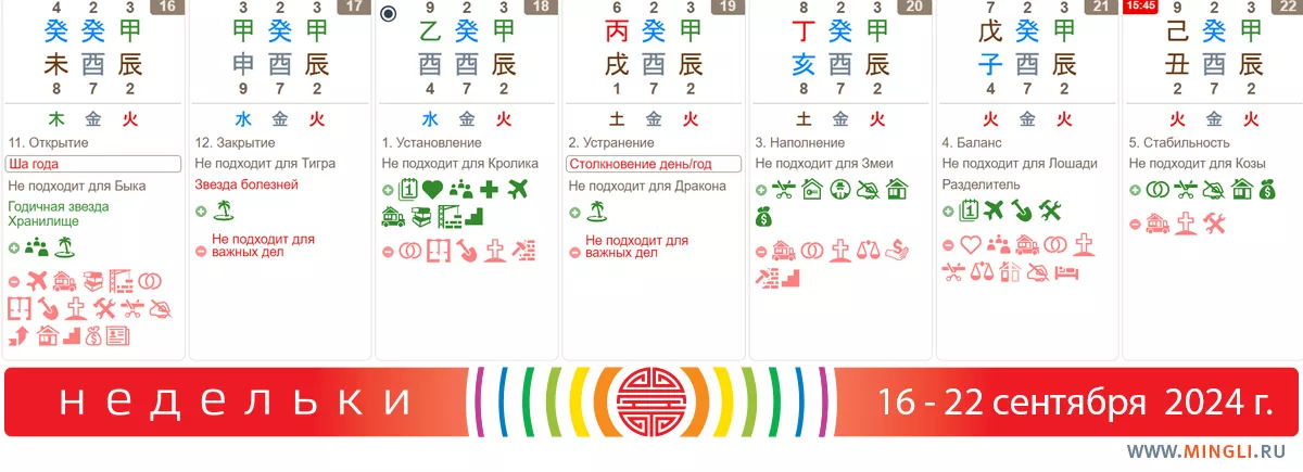 19 сентября, четверг. Ша сегодня в центральном дворце, но это не самое важное. Сегодня – Столкновение, а вместе с последствиями затмения это сочетание может не очень здорово влиять на людей. Собаки и Драконы в картах приходят в движение, вред Петух-Собака также может сыграть свою роль. Постарайтесь не совершать ничего спонтанно, не принимайте важных решений. Лучше отказаться от сложных переговоров, подписания документов и любых нервных мероприятий.