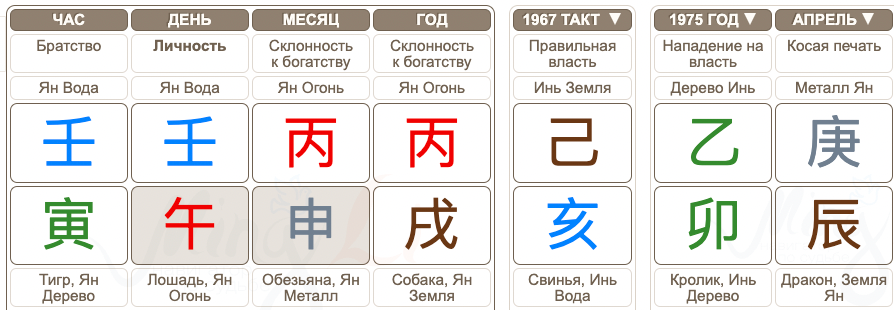 Что же ему помогло? В его карте есть и «Убийца на 7 позиции» – в земной ветви Собаки, который дает настойчивость, и тройка Огня – эмоции, чувства и вера в свои силы. И, конечно, в столпе дня звезда «Командное влияние» помогает вести за собой, устанавливать свои нормы и правила. В сочетании с Богатством она дает ему «чутье» на то, что может принести деньги.
