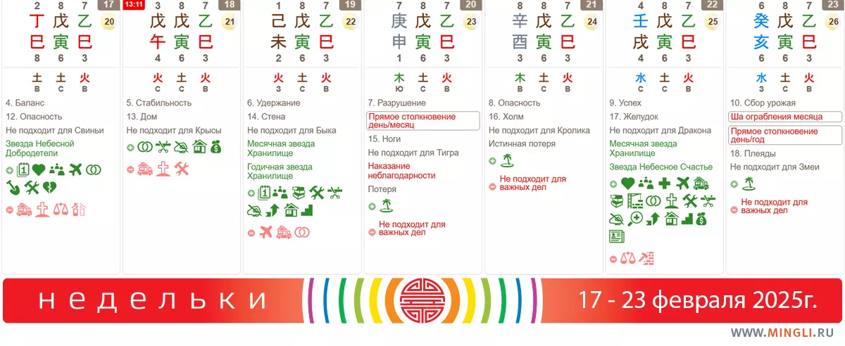 20 февраля, четверг. Будьте очень осторожны сегодня, особенно если в вашей карте Бацзы есть Огненное наказание, Тигры и Обезьяны. Во-первых, важные дела лучше не планировать, ничего, кроме проблем, они не принесут (судебные иски и споры, скандалы и любовные измены в течение 3-5 лет), плюс, сам день не результативный. Во-вторых, высока вероятность травм и аварий, неприятностей от толпы или в толпе. Осторожнее за рулем и во время занятий спортом. Не вступайте в конфликты.