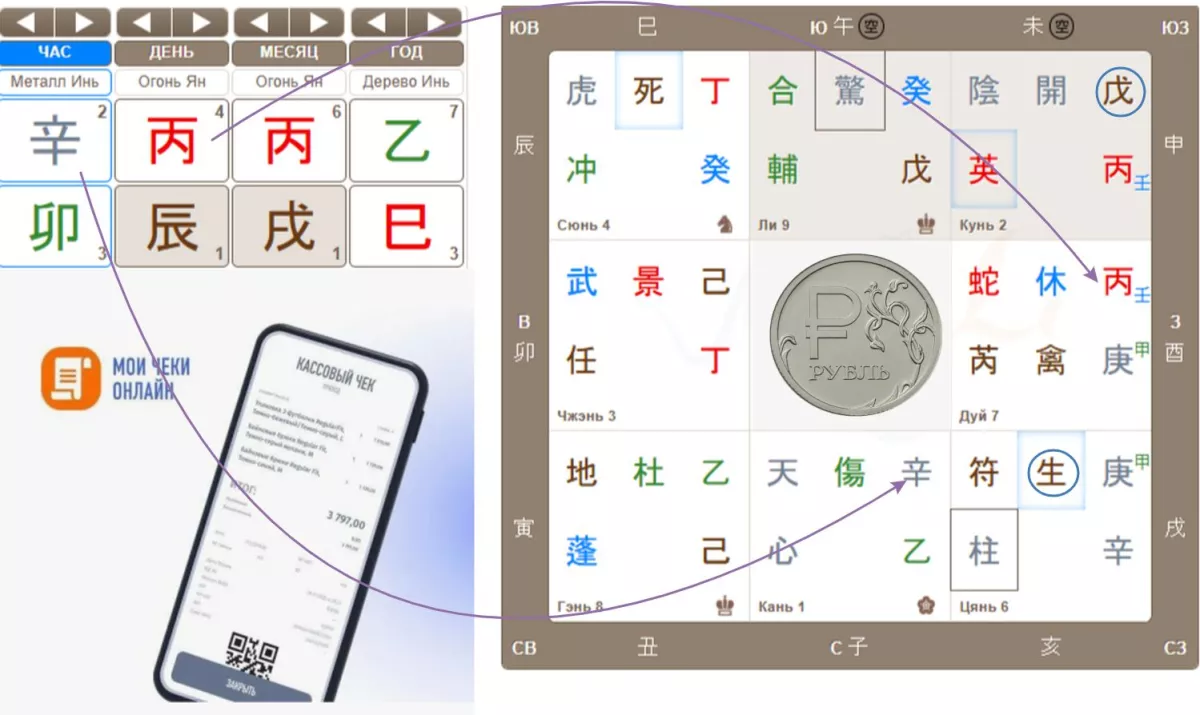 Взгляд сразу зацепился за такой момент: в каждом важном доме - у Вопрошающего 丙НС дня и у Небесного ствола часа辛 (дело) - звезда и врата разных стихий по У Син. Врата Отдыха (Вода) и Звезда Тянь Жуй (Земля) в доме Дуй, Врата Ранения (Дерево) и звезда Тянь Синь (Металл) в доме Кань. Контроль, перекос, словно что-то не сходится. Отметила это себе на полях!