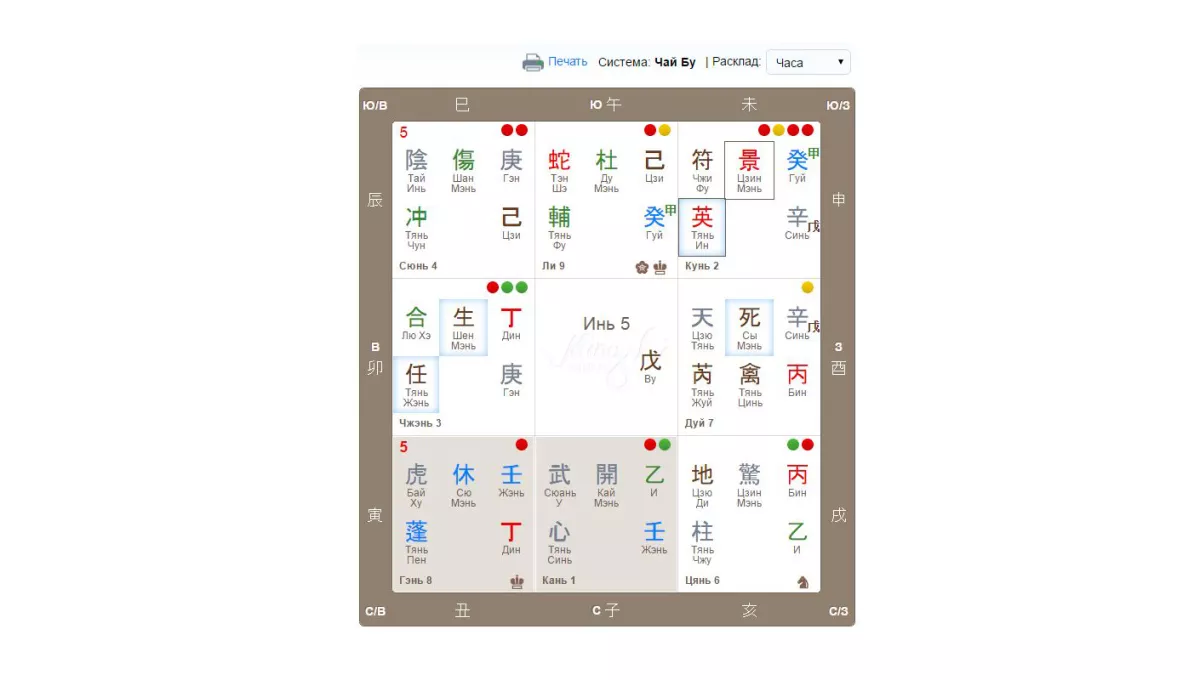 Система Чай Бу подстраивается под солнечные сезоны. Расклад часа резко меняется в час смены сезона, а также в дни Цзи 己 и Цзя 甲. Именно из-за резкой смены расклада поклонники Чжи Жунь критикуют Чай Бу.) Но факт остается фактом – расклад по Чай Бу рассчитать проще, это можно сделать буквально «на пальцах», зная номера раскладов, соответствующие конкретному солнечному сезону и взяв в руки китайский календарь. В Чжи Жунь же календари и авторы спорят друг с другом на тему, когда же делать вставку в 15 дней.