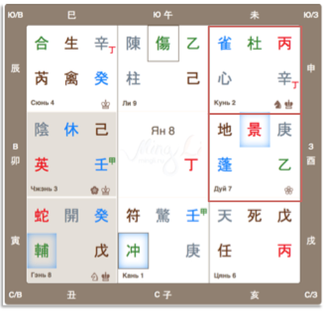 Ствол 庚 выпал во дворец Дуй: структура 庚乙, для 庚 ствол 乙 – Прямое богатство или женщина, жена. Рассуждаем: мужчина 庚 готов к отношениям, он привлекателен для противоположного пола (персик расклада), ярок (景), интеллектуален (蓬) и, в то же время, очень уютный, домашний (地).