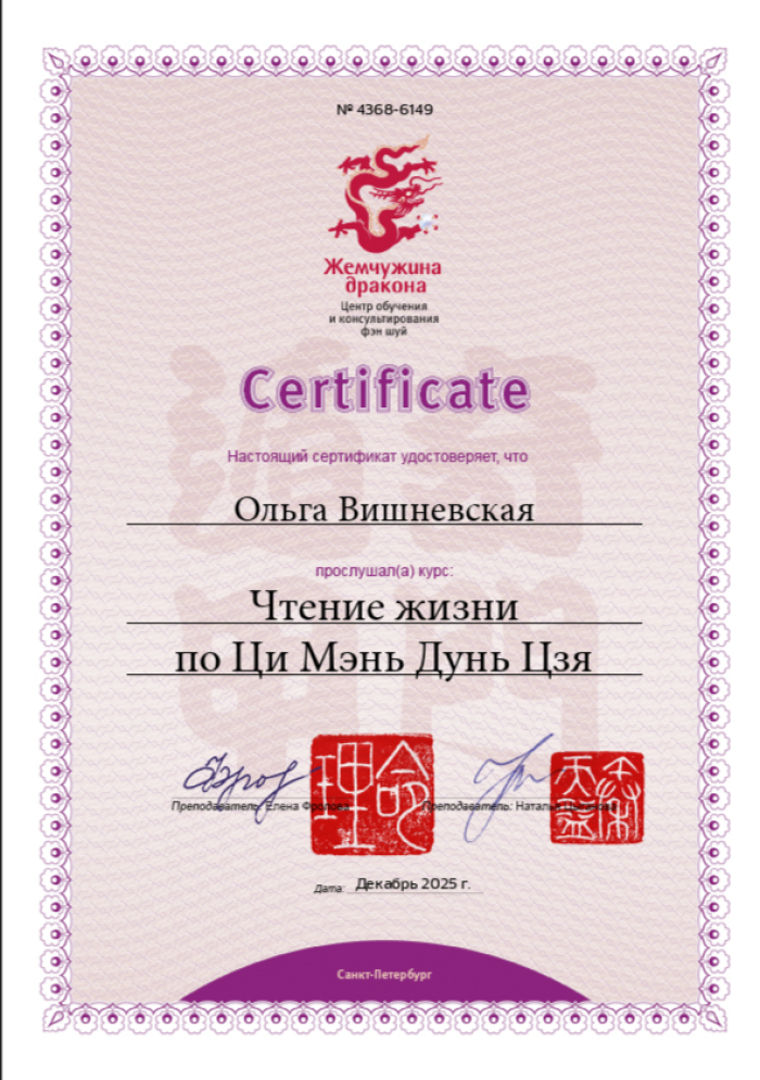 Являюсь сертифицированным консультантом по специализациям "анализ судьбы", «фэн-шуй» и "повышение удачи" от центра обучения и консультирования "Жемчужина дракона".