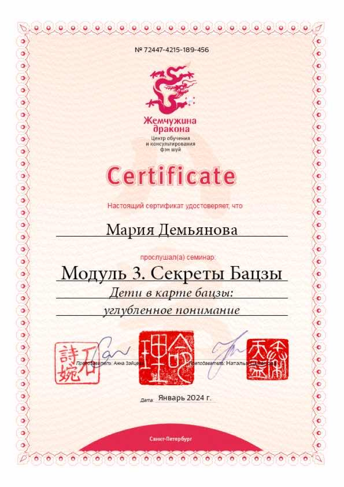 За последние годы я решила систематизировать свои разобщённые знания по фэн шуй и другим наукам китайской метафизики, за что безмерно благодарна школе Mingli, в которой я приобрела прочный фундамент по фэн шуй, бацзы, ци мэнь дунь цзя. Также мне посчастливилось пройти «золотой стандарт Сань Хэ», включающий императорский фэн шуй, внешний и внутренний Сань Хэ, у Мастера Вин Лео, а также пройти курс «Летящие звёзды Сань Юань» по лицензии Мастера Френсиса Леяу.