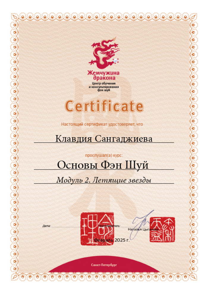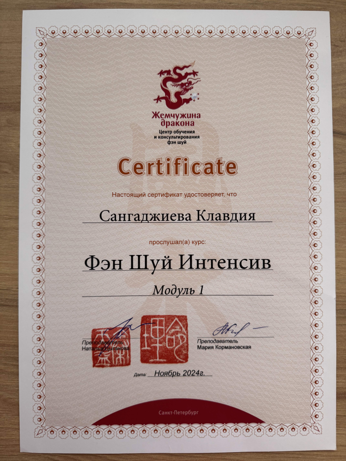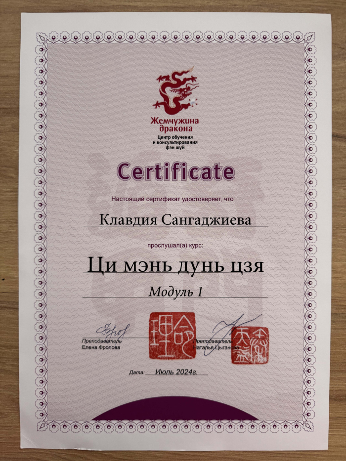 Меня зовут Клавдия, я сертифицированный консультант по Бацзы от центра обучения и консультирования "Жемчужина Дракона". С января 2023 года прошла все обучающие курсы по Бацзы на Минли. С осени 2023 года успешно провожу консультации. От всей души благодарю за полученные знания преподавателей, Анну Зайцеву и Наталью Цыганову. На данный момент продолжаю обучение на курсе по фэн шуй на Минли.